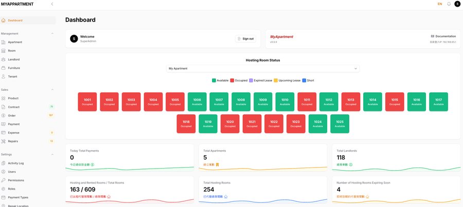 整合租賃合約、收款、維修、住戶管理的全功能物業平台,支援多公寓、多房東、多角色權限。